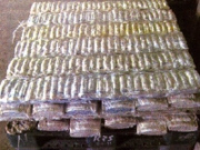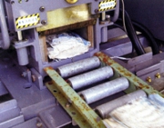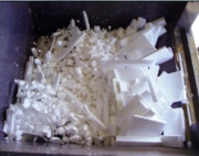 発泡スチロールを破砕し、細かくした後、電熱により溶融する事で、再生利用可能なインゴット化します。