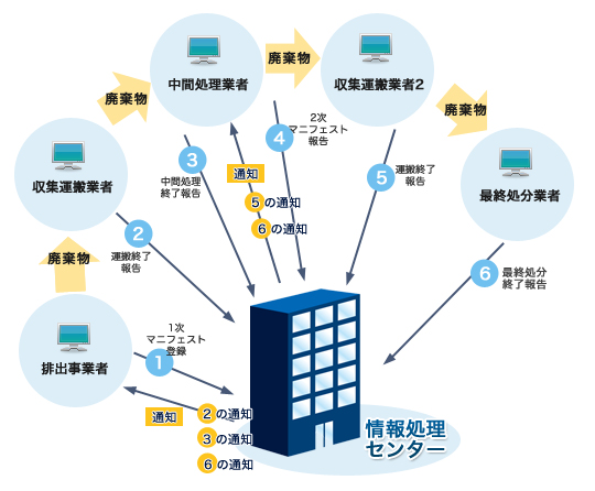 マニフェストは、紙マニフェストと電子マニフェストがあります。 電子マニフェストは、マニフェストを電子化し、排出事業者、収集運搬事業者および処分業者の三者が情報処理センターを介した通信ネットワークを使って、排出事業者が委託した産業廃棄物の流れを最終処分まで確認する仕組みです。